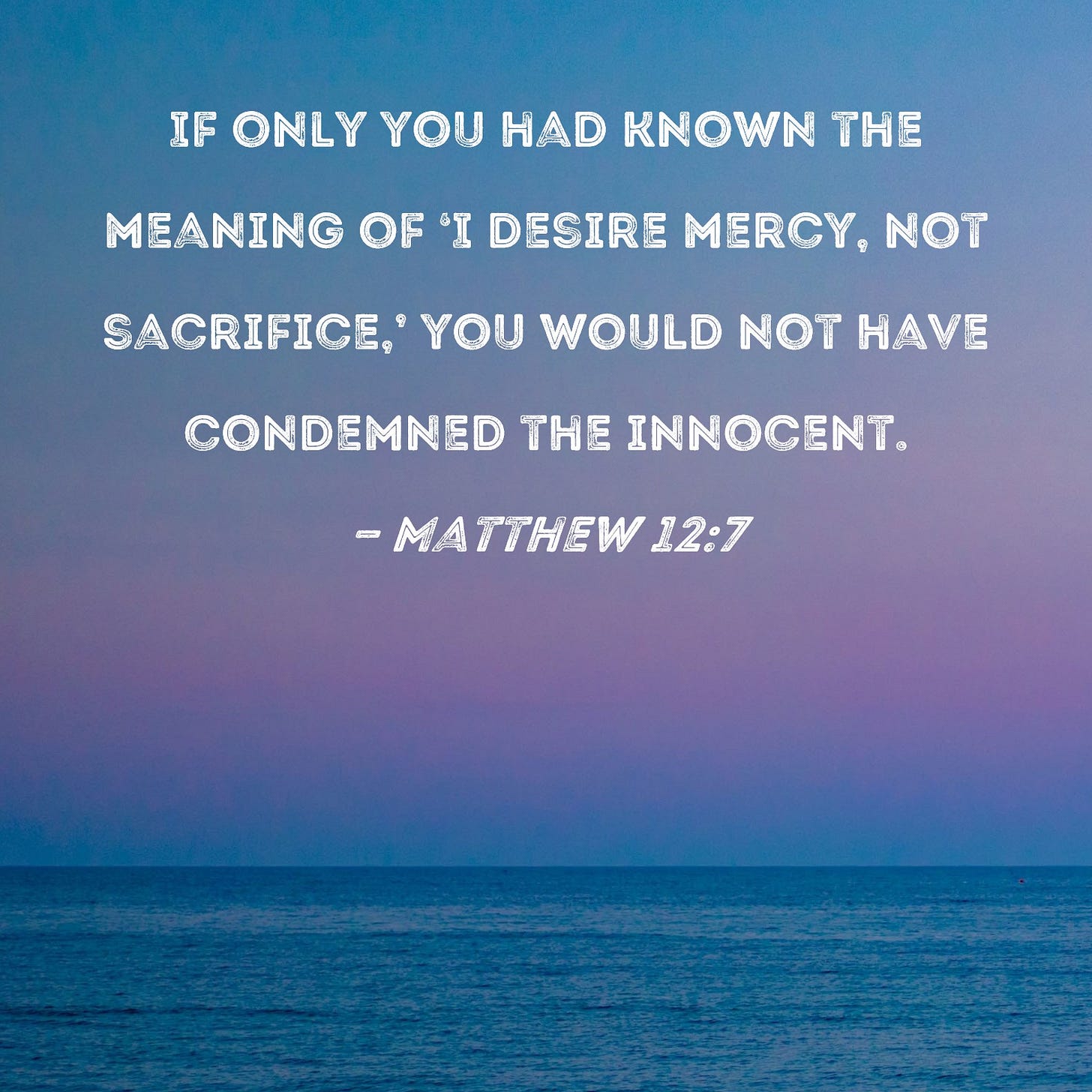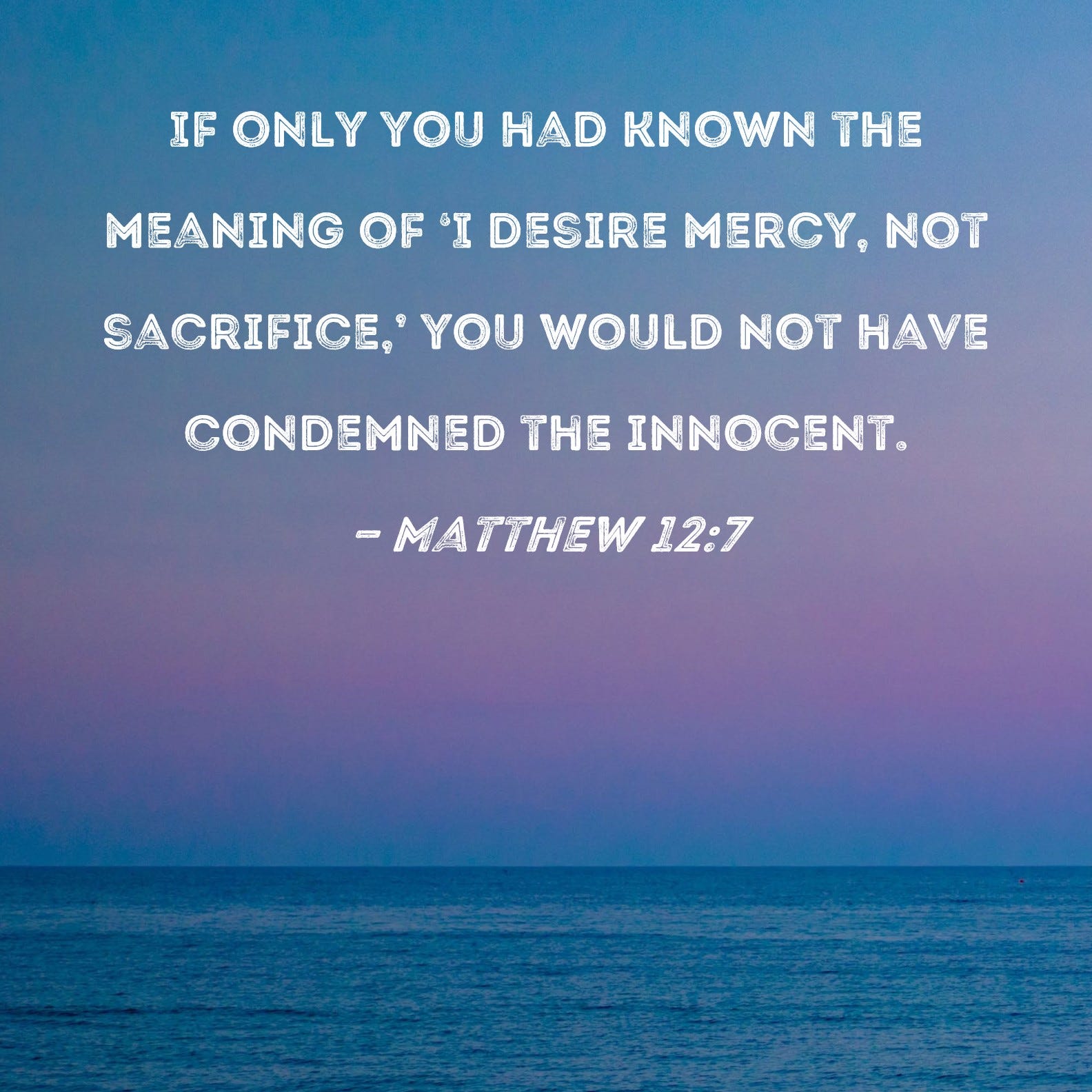 Matthew 12:7 emphasizes that God values mercy and compassion over ritualistic sacrifices, highlighting the importance of understanding His heart rather than merely following rules.