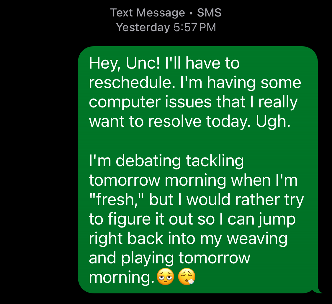 As I was wrapping up this journal entry, I heard a phone notification. It’s been quiet all morning, not naer ding, although messages would come through as I had my phone in eyeshot. I was charging it, feet away when I heard a ding. The message came from my unofficial official Nephew, Zandder. I noted the time: 3:38.