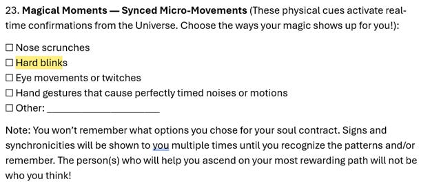 In my 23 and Me Soul Contract, I mentioned wanting to see hard blinks and nose scrunches as cues and magical moments from The Universe!